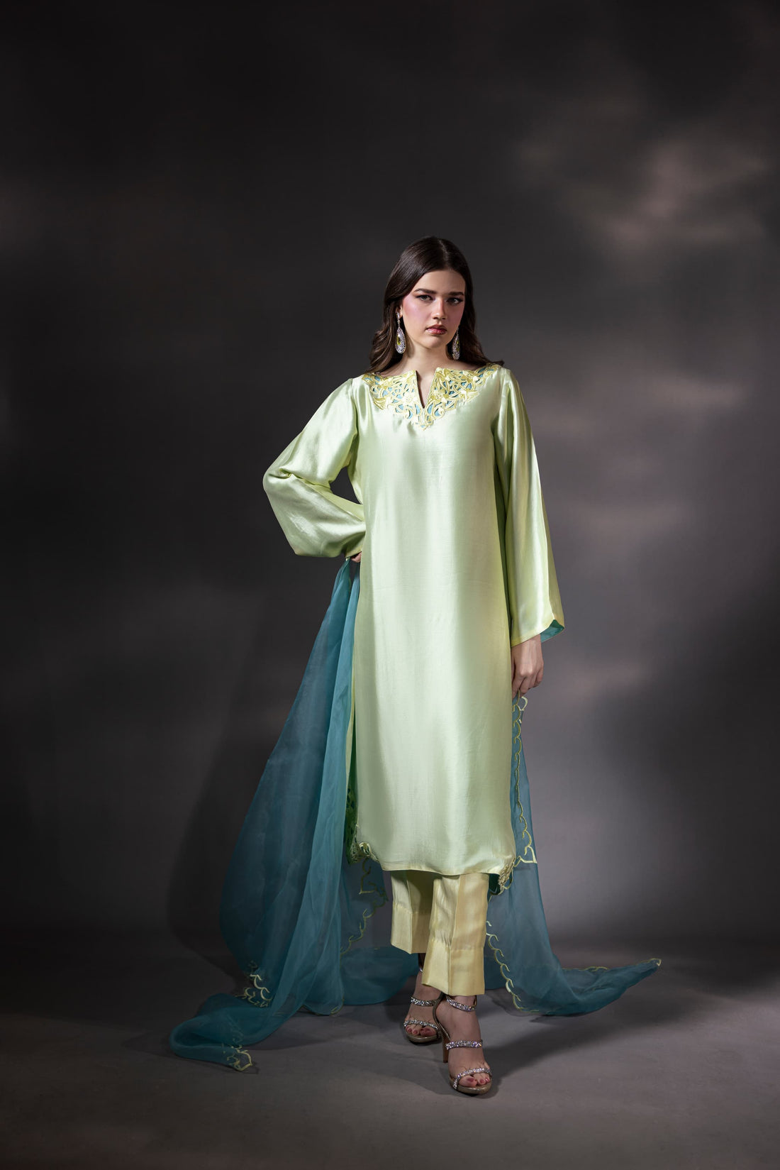 3 Piece: Shirt: Pure Silk Pants: Pure Silk Dupatta: Organze Details: Embrace...