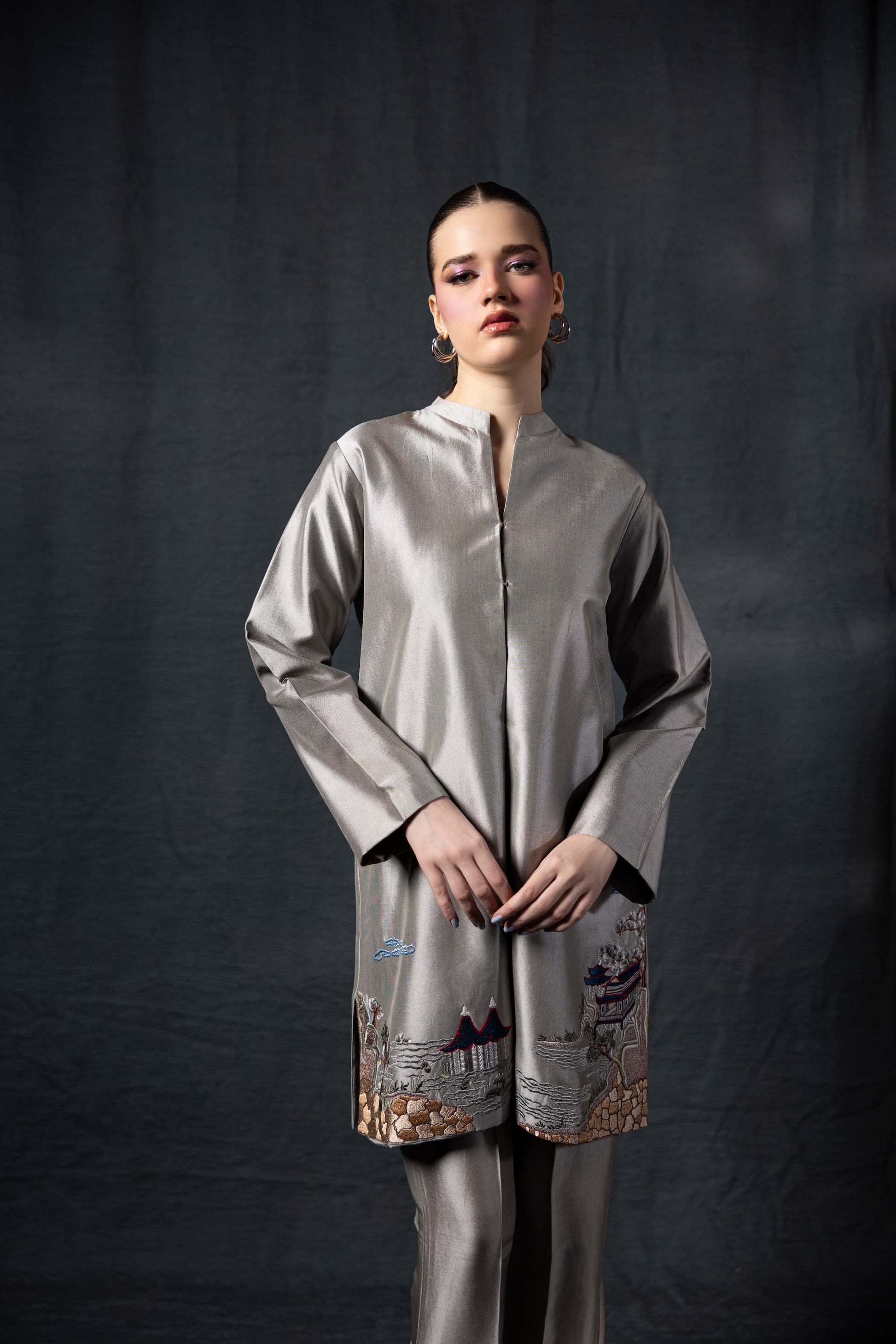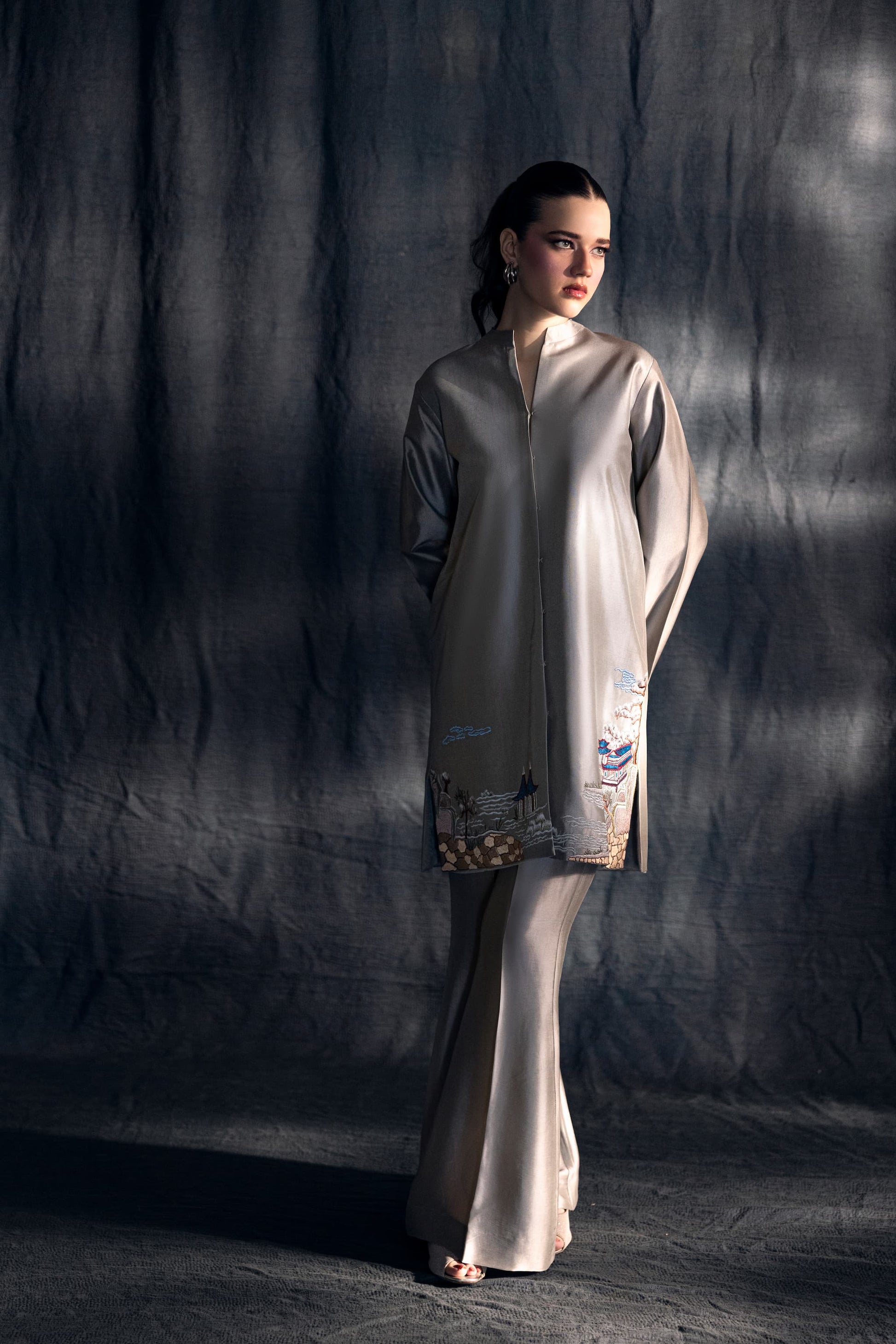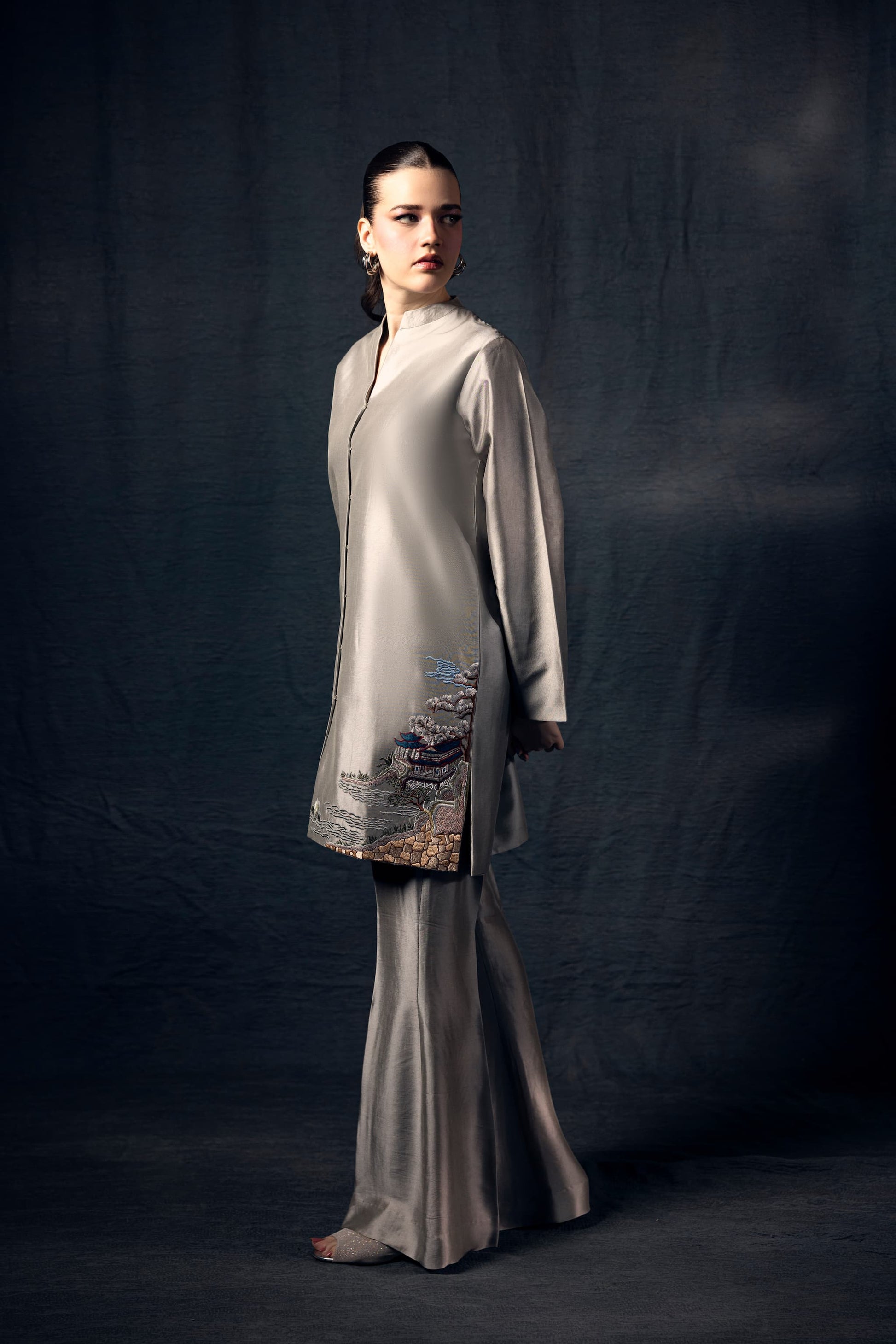 The centerpiece is a magnificent long jacket, crafted from luminous silver grey pure silk that drapes and flows with an effortless grace. Designed in a chic front-open style, it offers a glimpse of the outfit beneath while maintaining a silhouette of fluid grandeur.