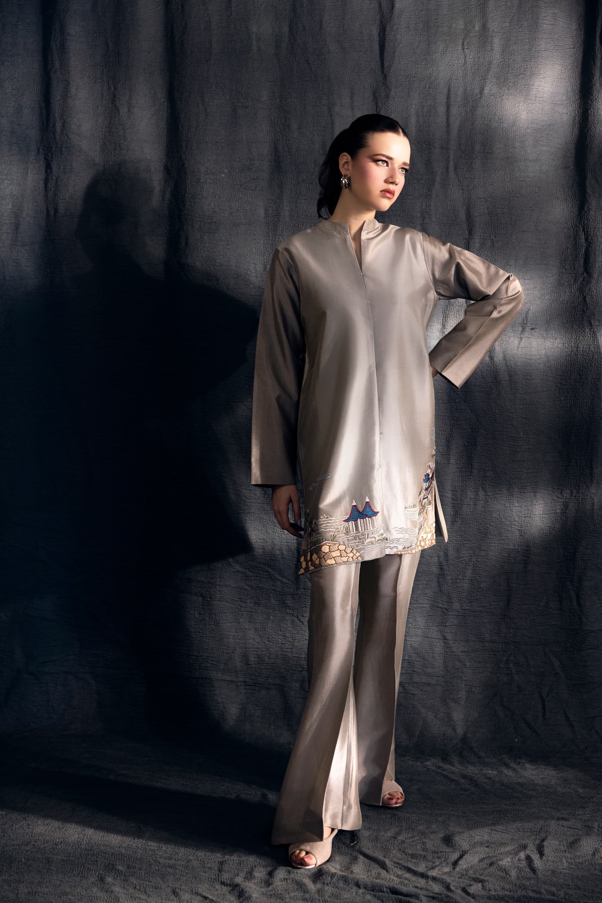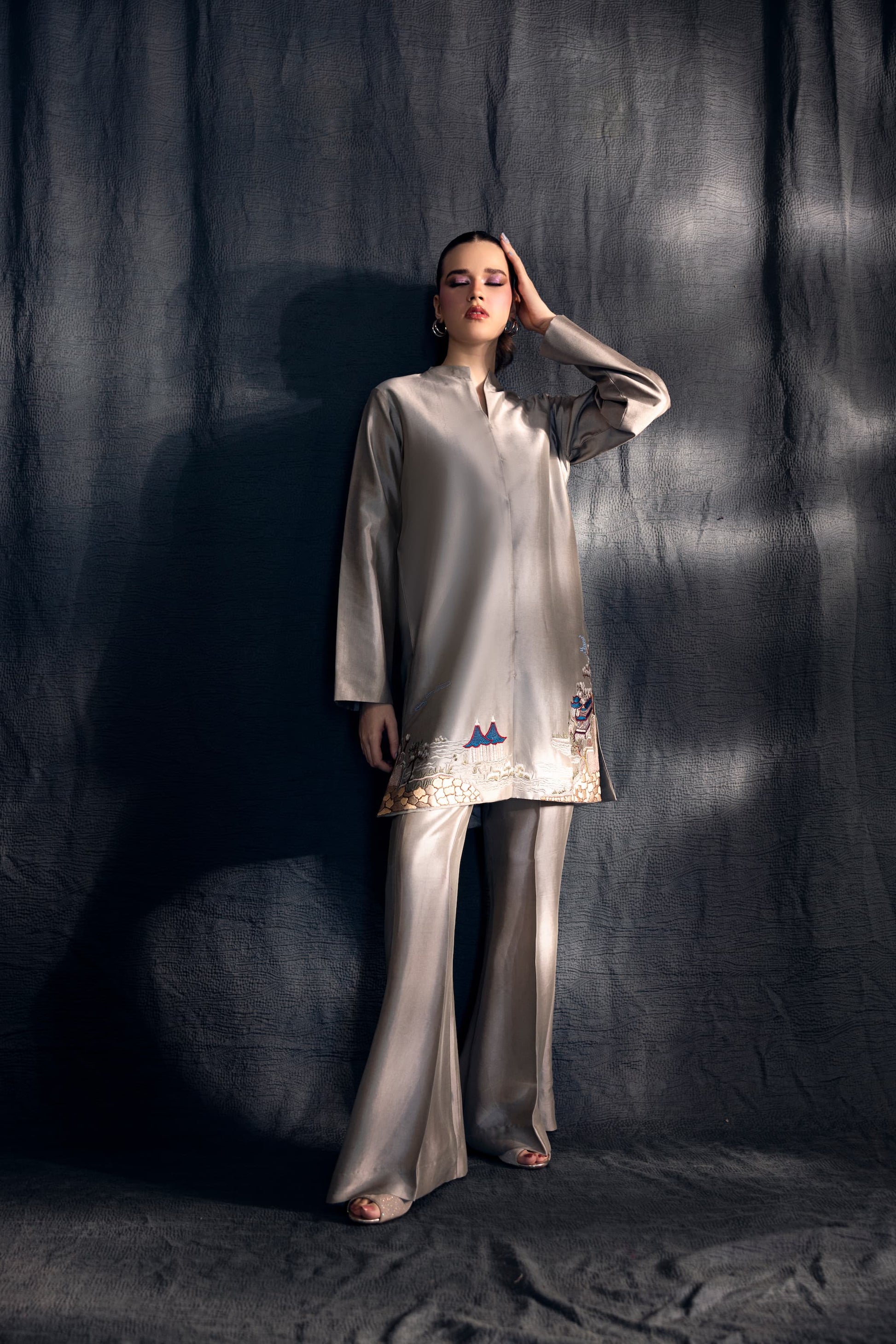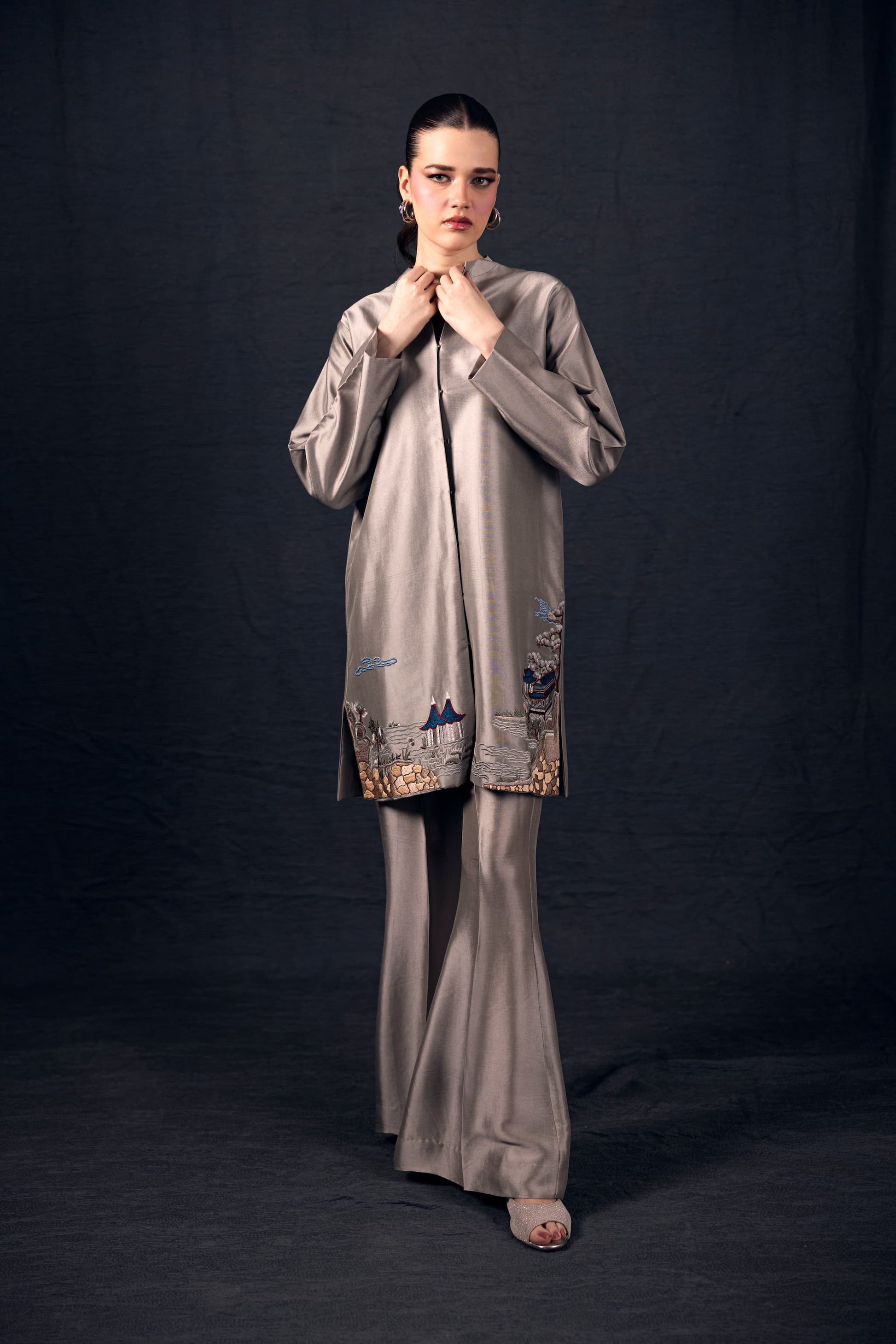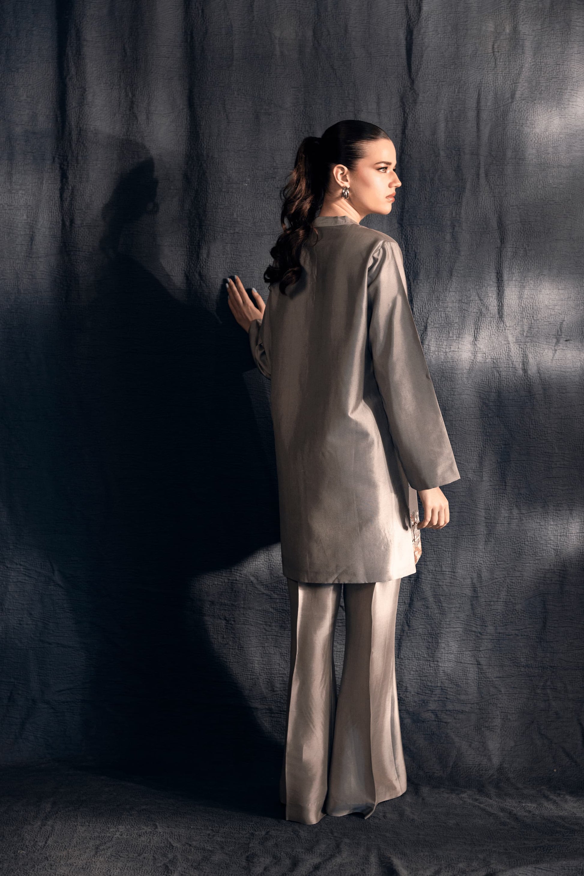 The centerpiece is a magnificent long jacket, crafted from luminous silver grey pure silk that drapes and flows with an effortless grace. Designed in a chic front-open style, it offers a glimpse of the outfit beneath while maintaining a silhouette of fluid grandeur.