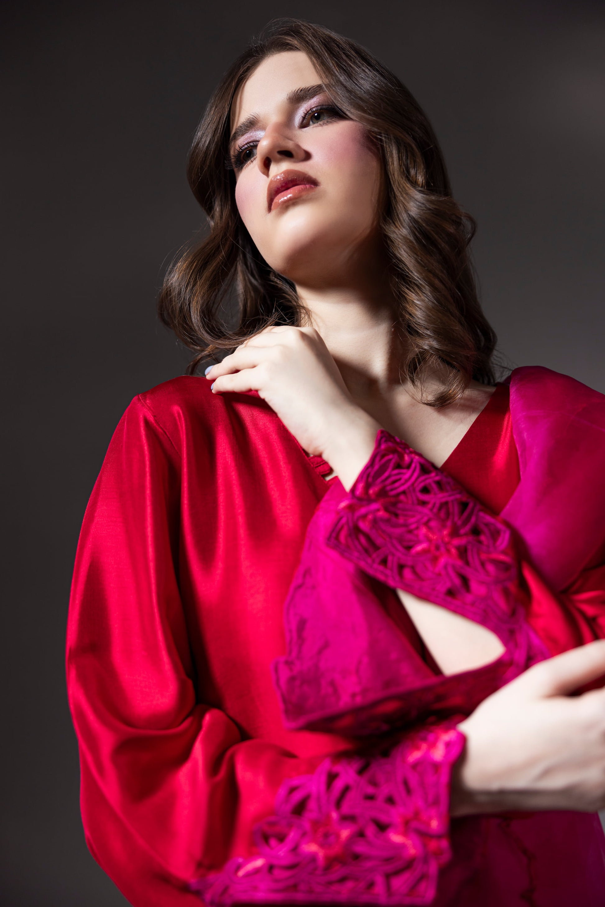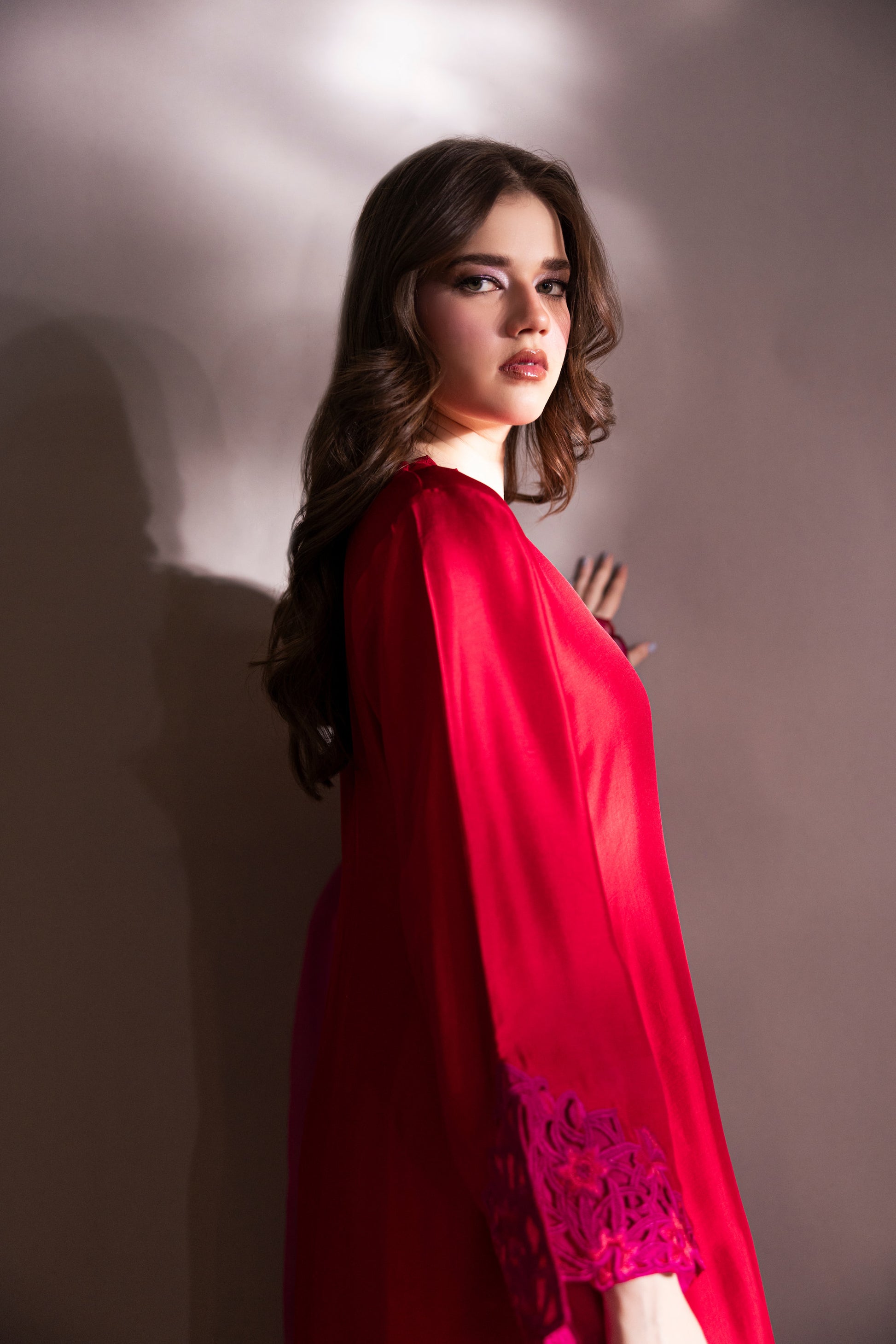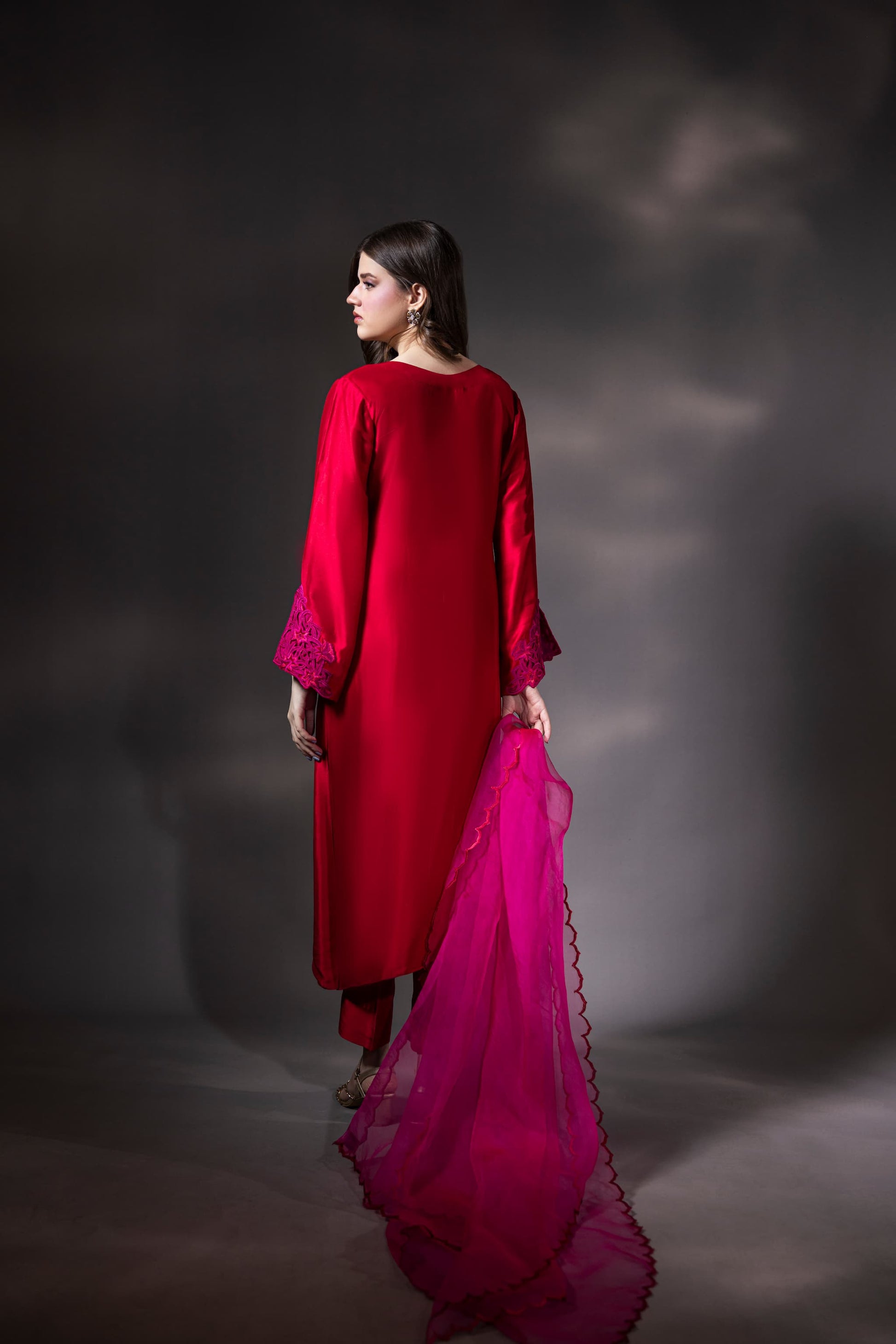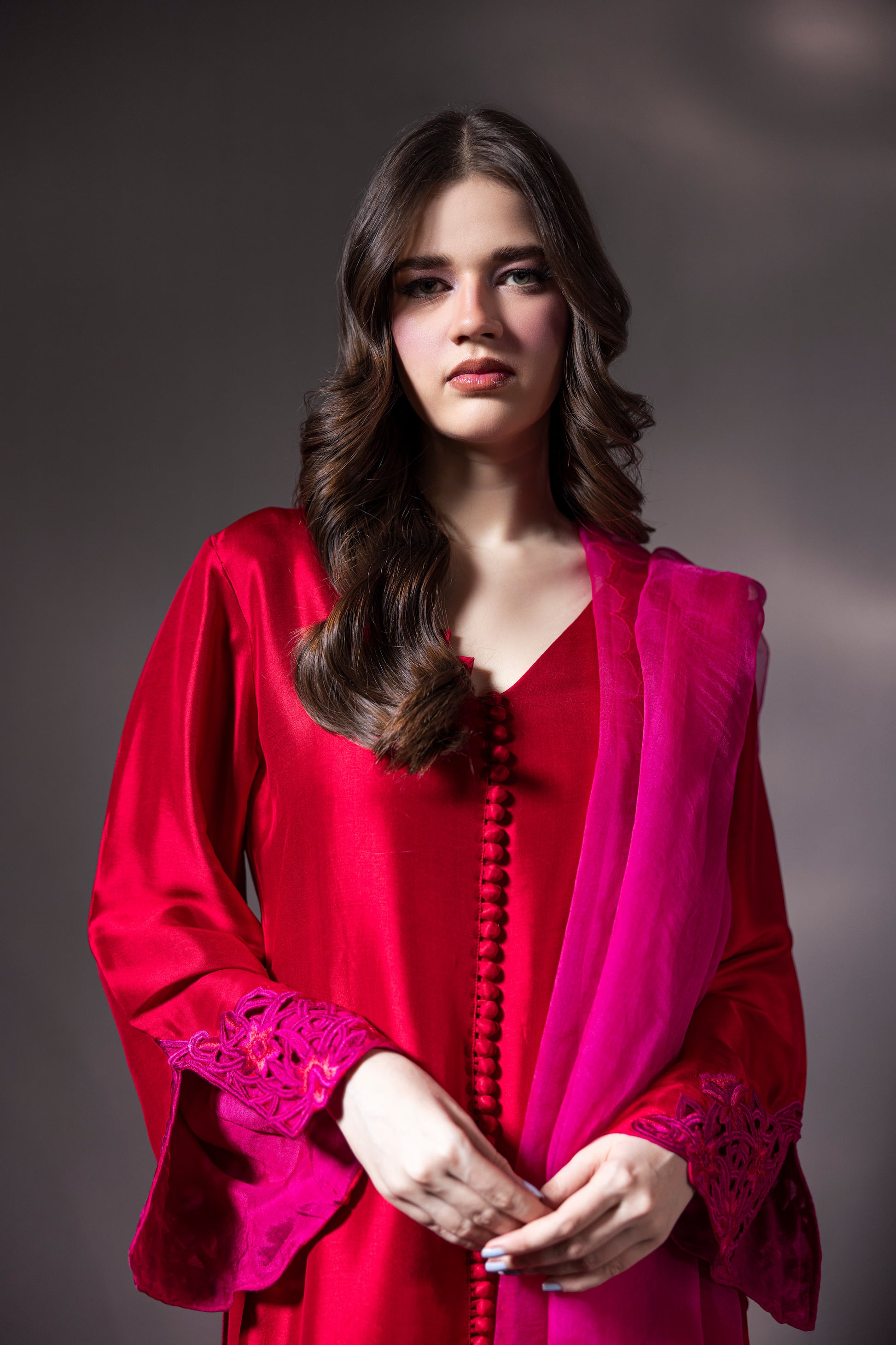 3 Piece: Shirt: Pure Silk Pants: Pure Silk Dupatta: Organza Details: Where passion meets artistry. This ensemble tells a story in two acts of vibrant color.