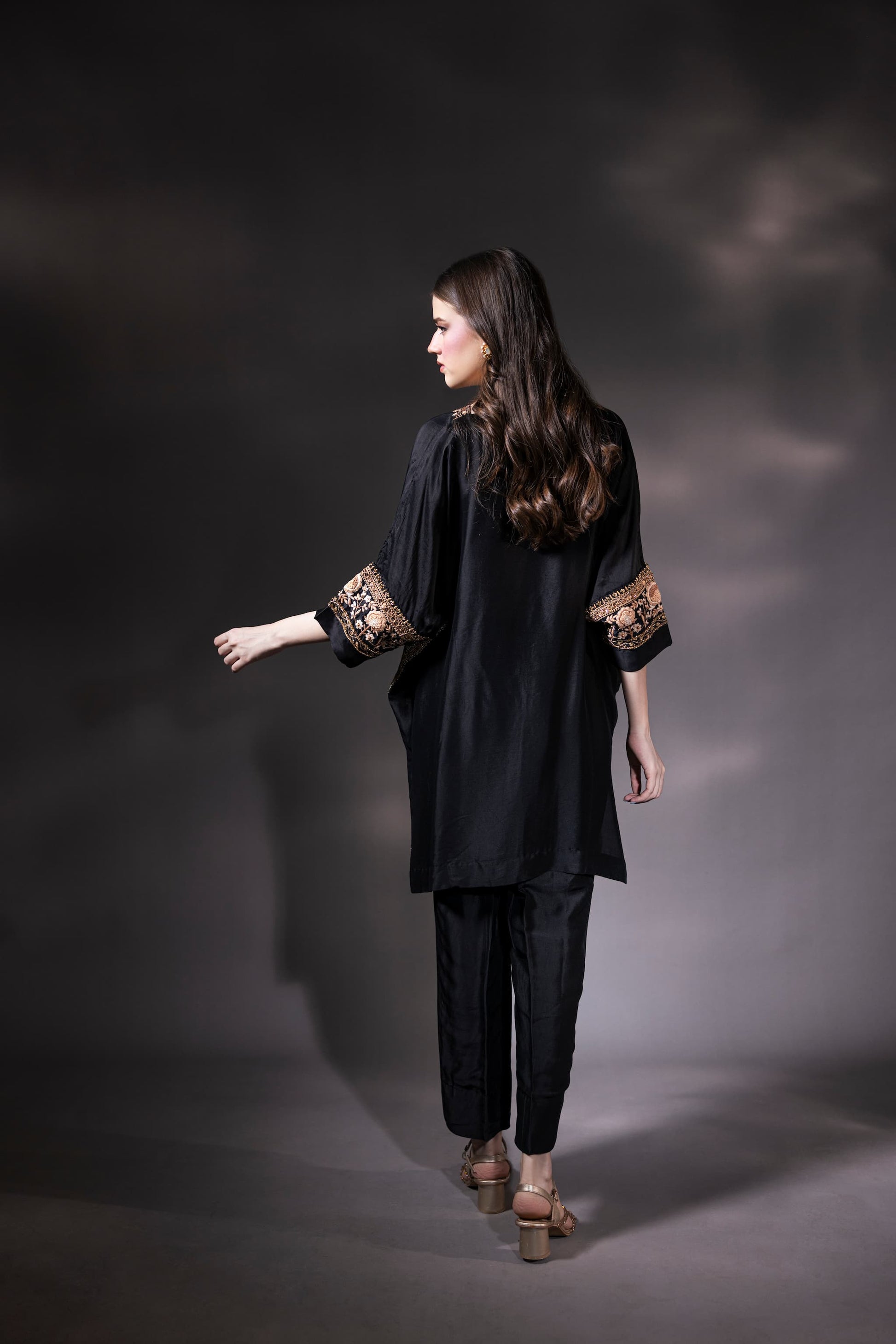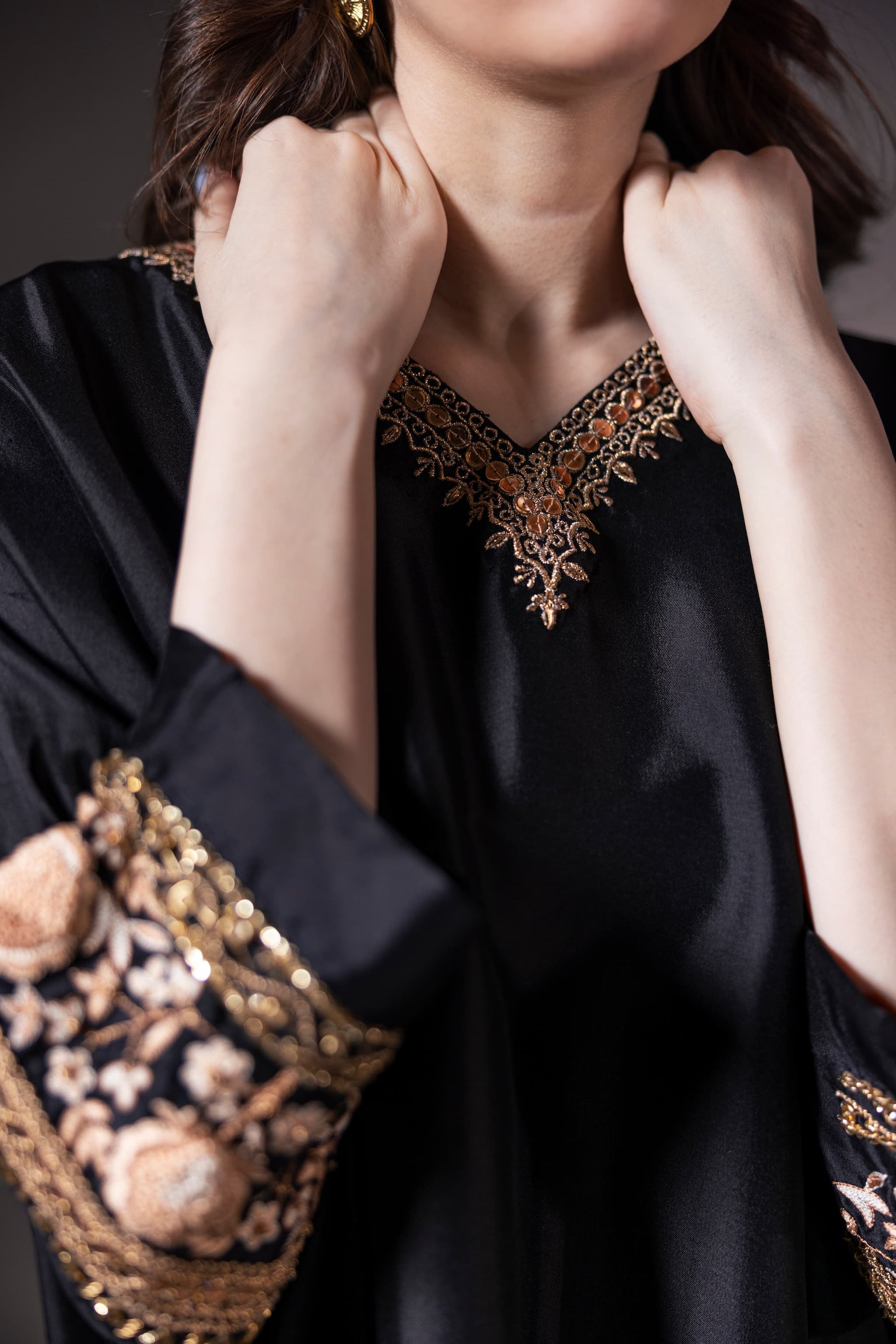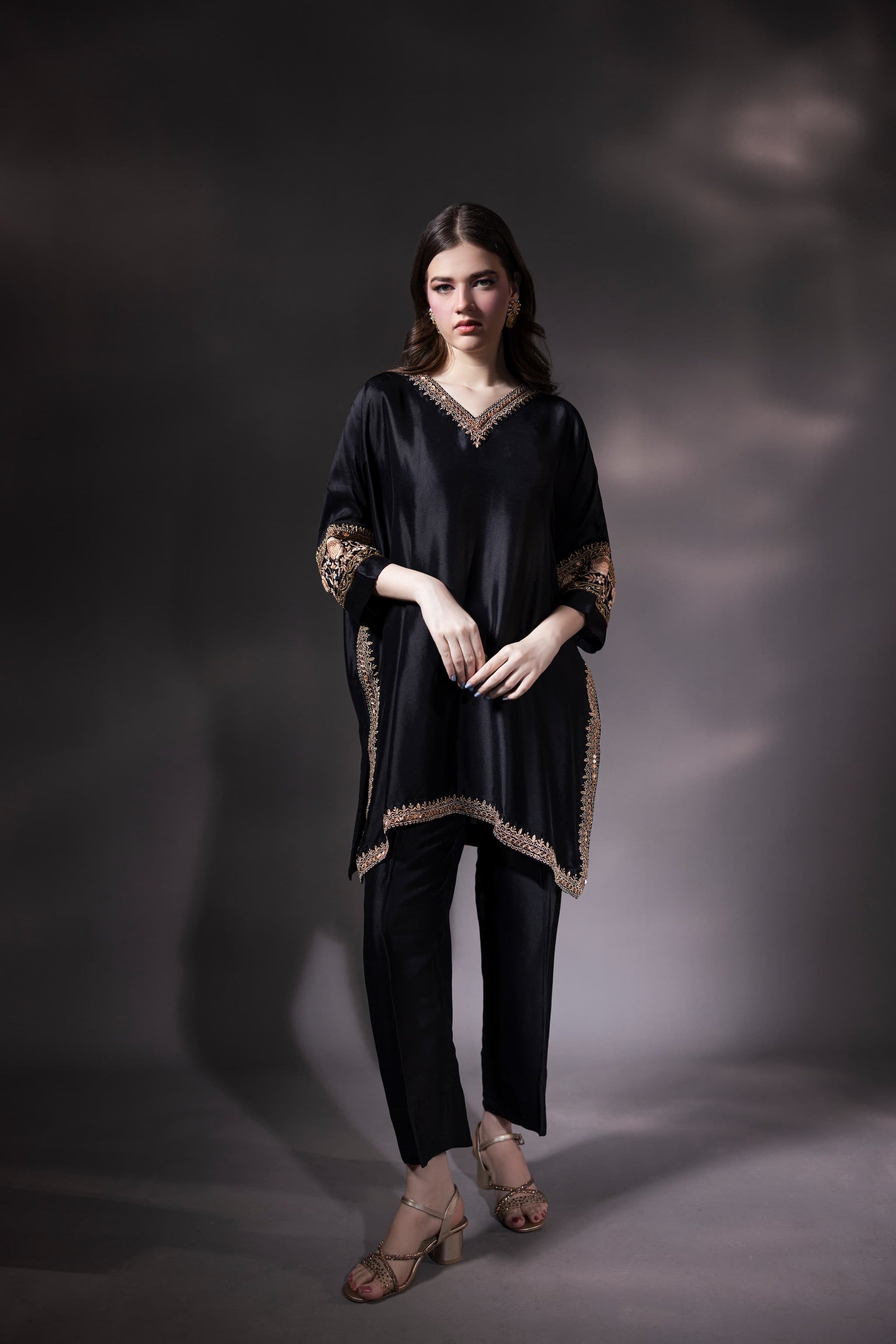 The centerpiece is a breathtaking short-length top, designed in a versatile butterfly or kaftan style. Crafted from lustrous black silk, it drapes and flows with an effortless grace, catching the light with a subtle sheen. The design draws the eye to a deep V-neckline, which is framed by an exquisite embroidery that masterfully blends the richness of zardosi with the precision of machine work. This beautiful detailing cascades down the butterfly-style side edges and graces the daman (hem), creating a cohesive frame of shimmering texture.
