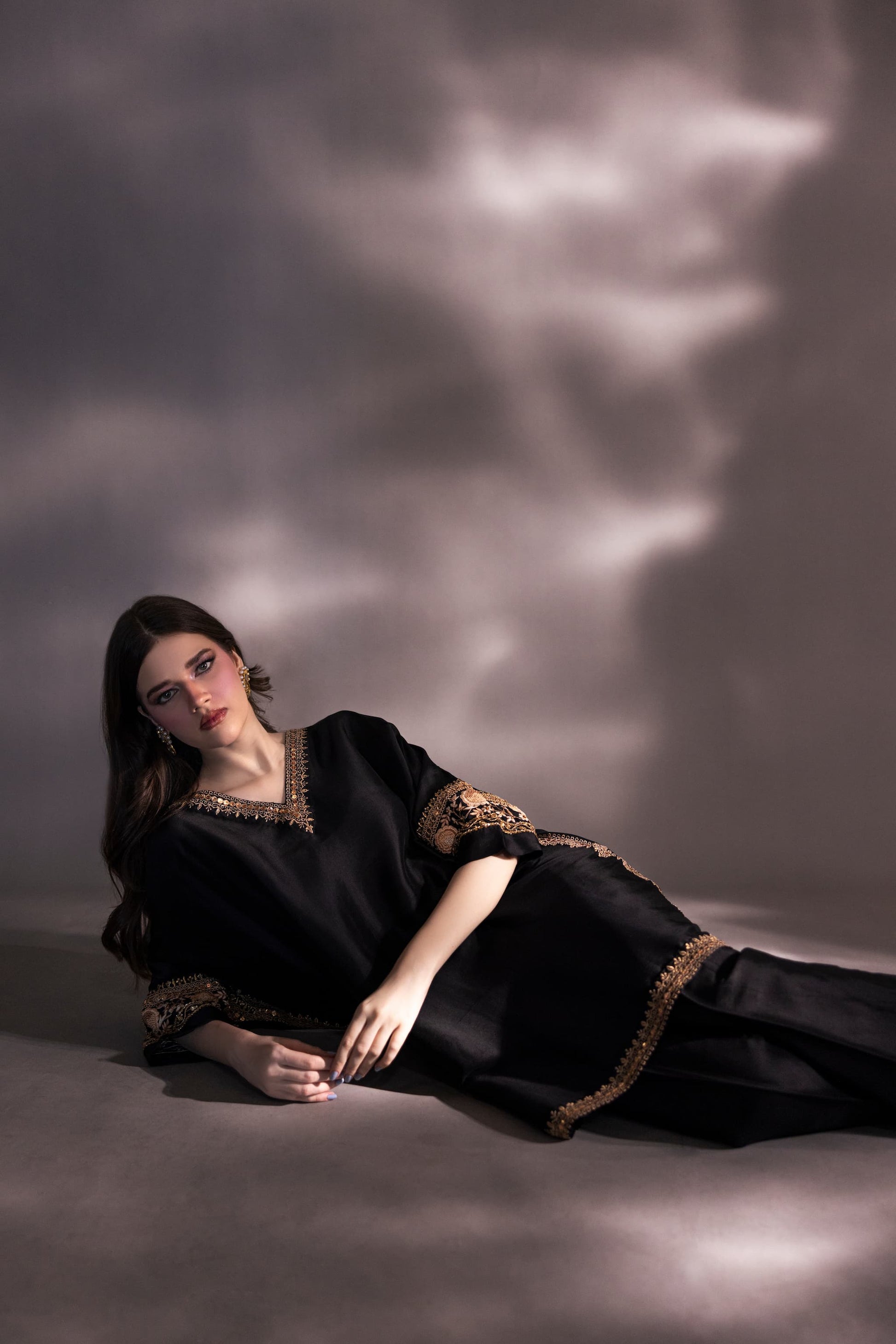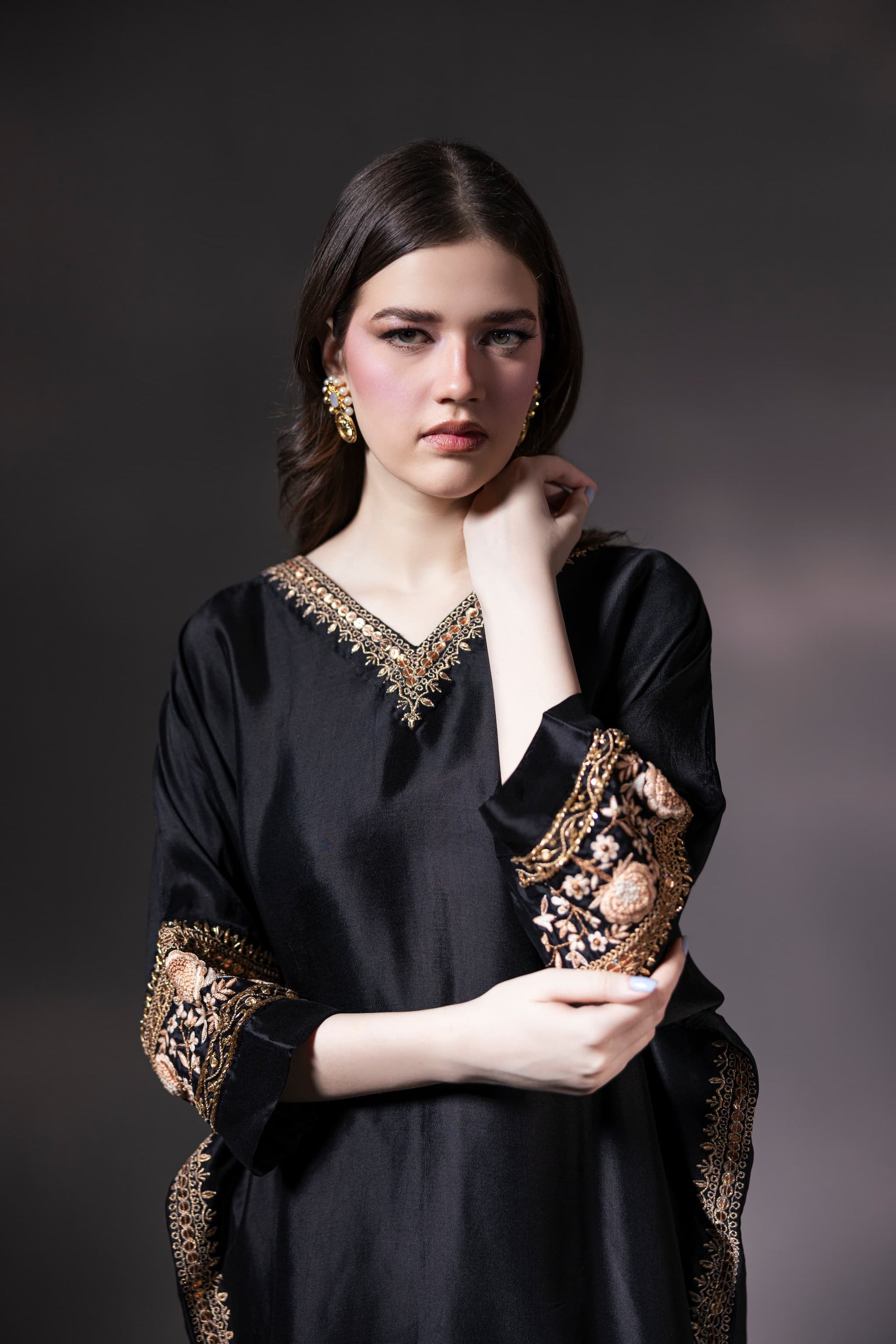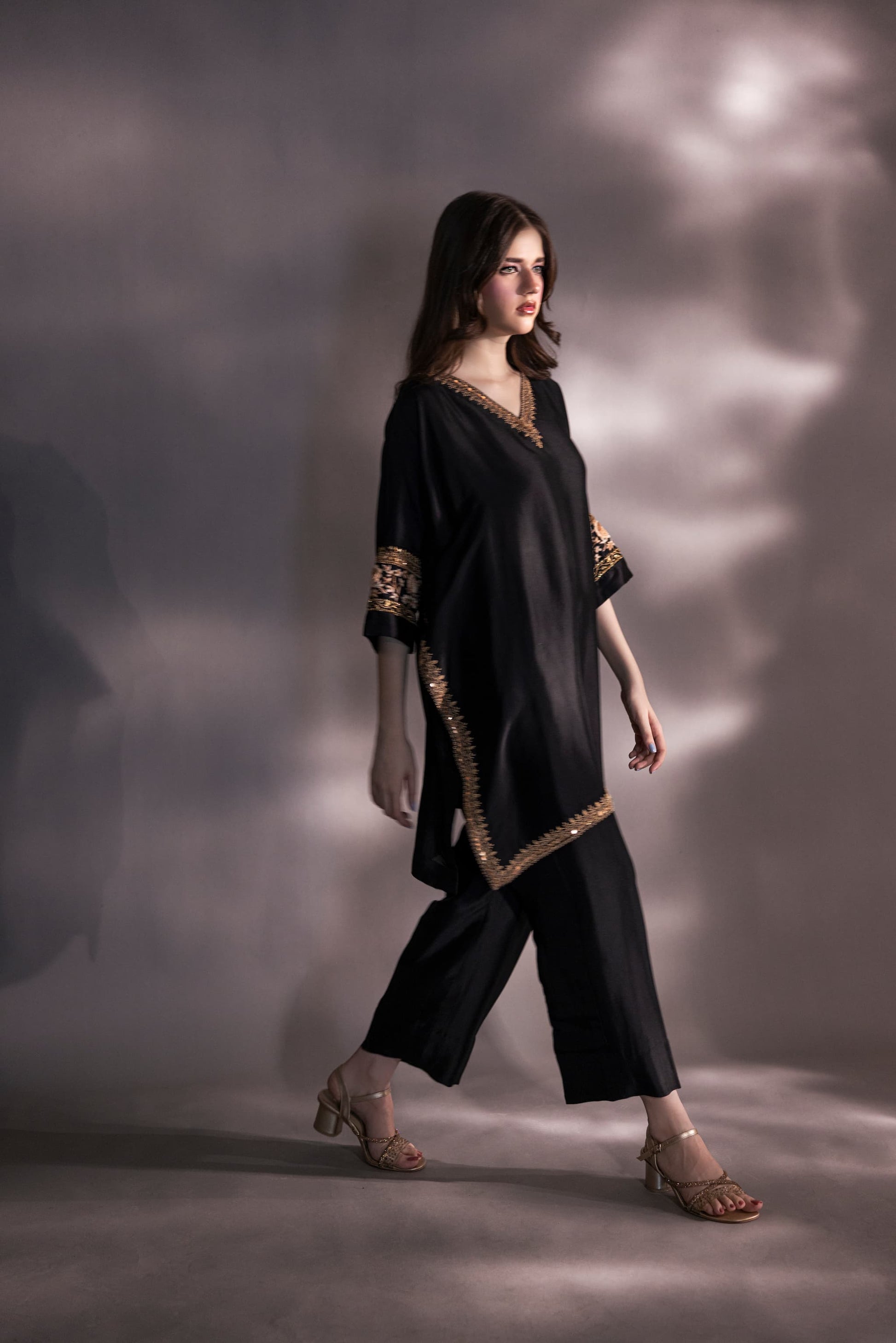 The centerpiece is a breathtaking short-length top, designed in a versatile butterfly or kaftan style. Crafted from lustrous black silk, it drapes and flows with an effortless grace, catching the light with a subtle sheen. The design draws the eye to a deep V-neckline, which is framed by an exquisite embroidery that masterfully blends the richness of zardosi with the precision of machine work. This beautiful detailing cascades down the butterfly-style side edges and graces the daman (hem), creating a cohesive frame of shimmering texture.