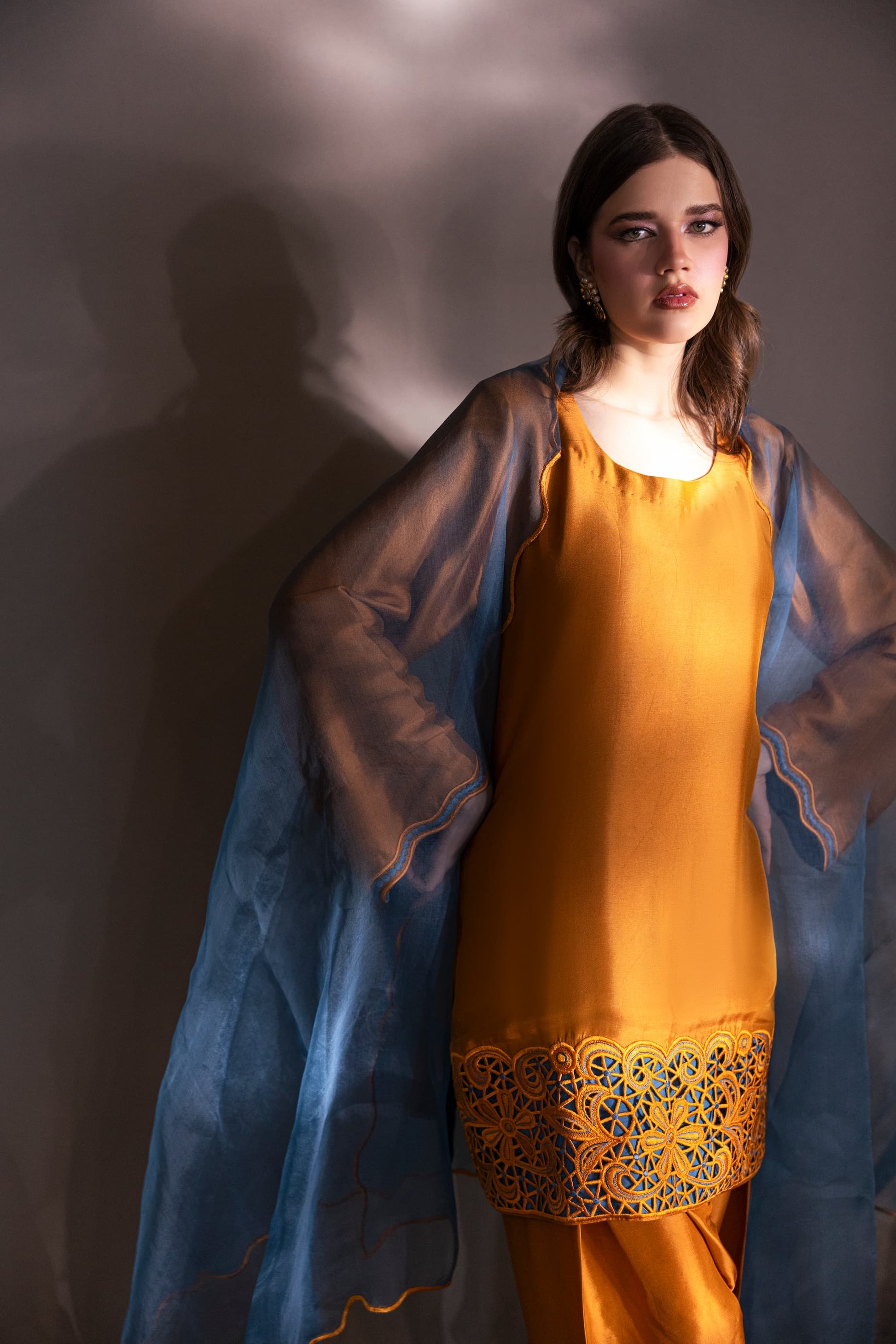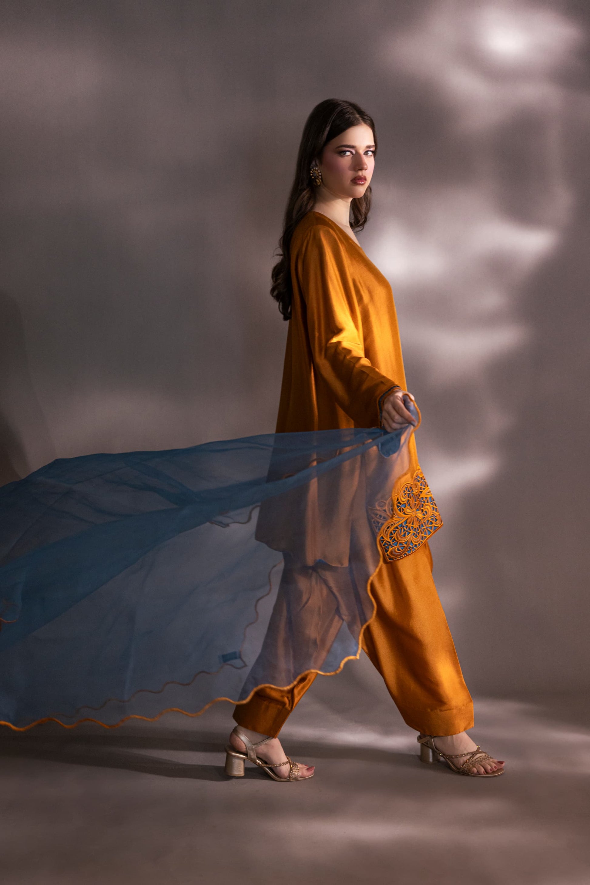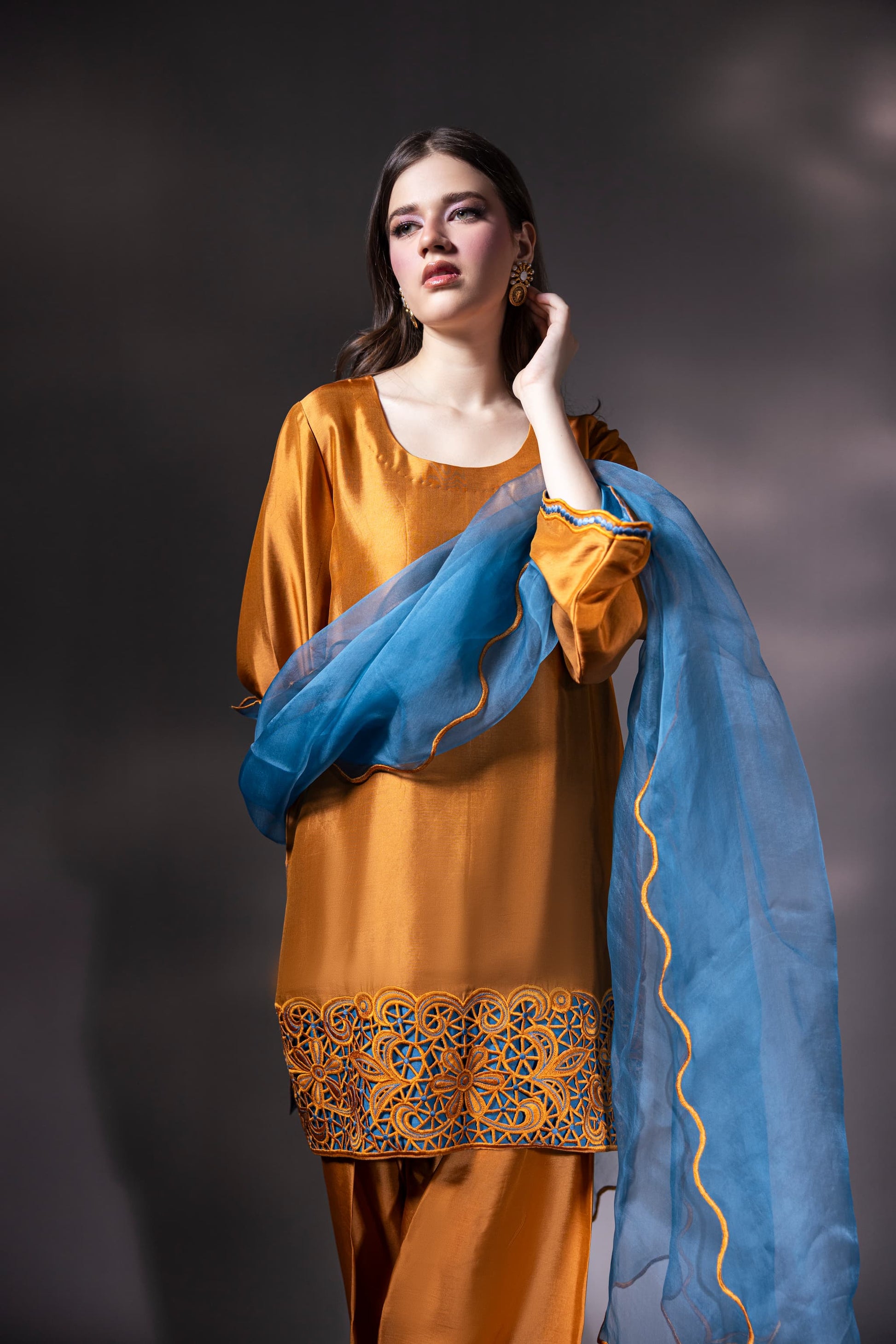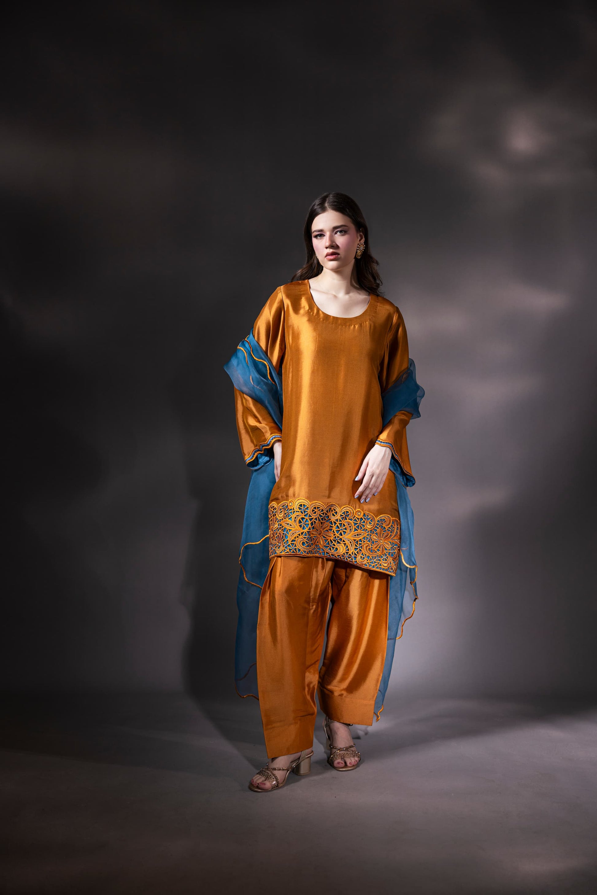 Where earthy warmth meets cool sophistication. This rust-hued shalwar kameez tells a story of contrast and harmony. Crafted from lustrous pure silk, the short shirt flows with an effortless grace, its warmth tempered by a secret whisper of steel blue lining within. The hemline is a delicate frame of intricate cut work, while the sleeves bloom with sleek embroidery, each stitch a testament to dedicated artistry. Draped over your shoulders, the pure organza dupatta floats like a cloud, its borders embroidered to match the kameez's ornate soul. This is more than an outfit; it's a statement of refined, modern elegance.